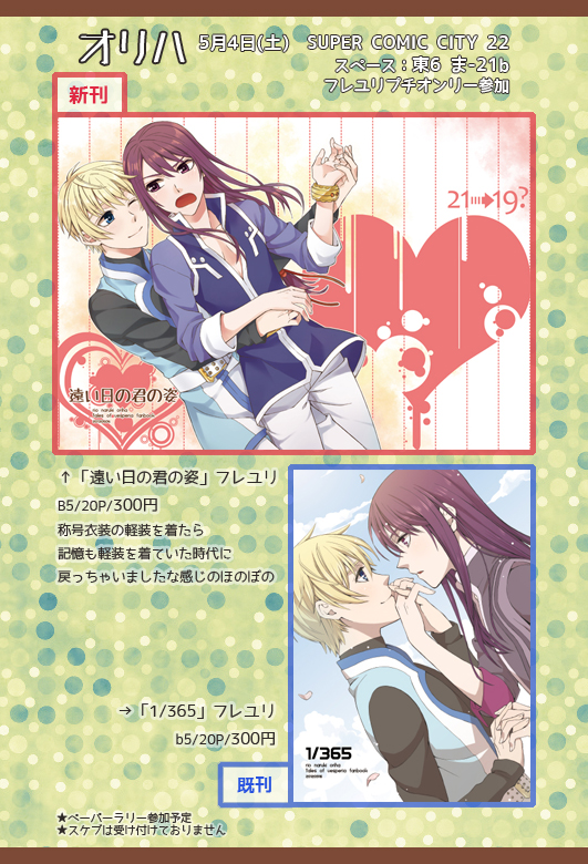 C85新刊の「オリハフレユリ再録本2」とらのあなさんで通販予約が始まりました。販売開始は2月上旬のようです。どうぞよろしくお願いします。【http://www.toranoana.jp/bl/article/04/0030/18/21/040030182129.html】
